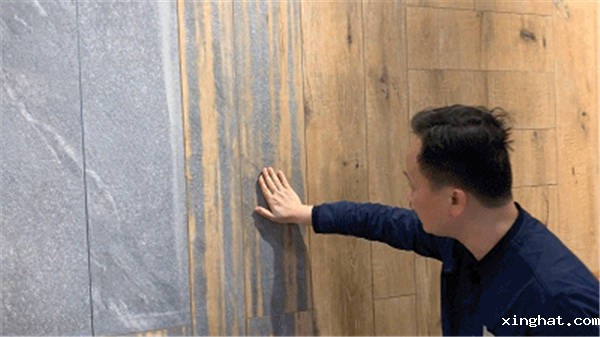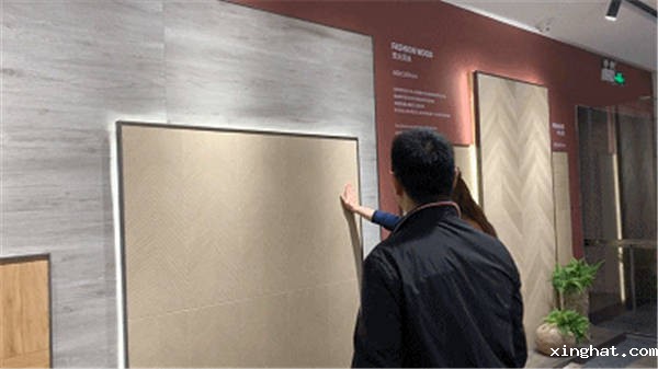 刚走进KT瓷砖,蔡老师和主持人就被墙面上的一款产品吸引了目光,这一款瓷砖的表面不仅有木纹,还夹杂有石纹,两种自然元素在同一款瓷砖上相映成趣。而这一款瓷砖正是KT瓷砖“木纹+”理念最好的展示。