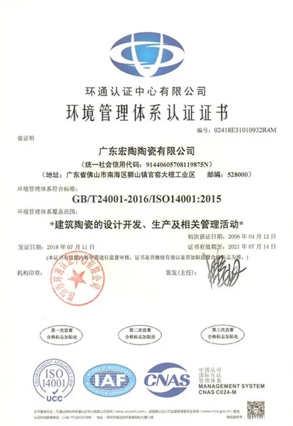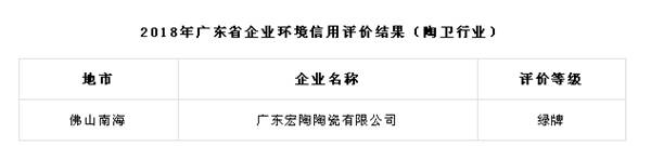 3月中,广东省生态环境厅对2018年广东省企业环境信用评价结果完成公示,包括宏陶陶瓷在内,共有17家企业评为绿牌(环保诚信企业)。其中宏陶陶瓷成为本次佛山市唯一获得绿牌企业。